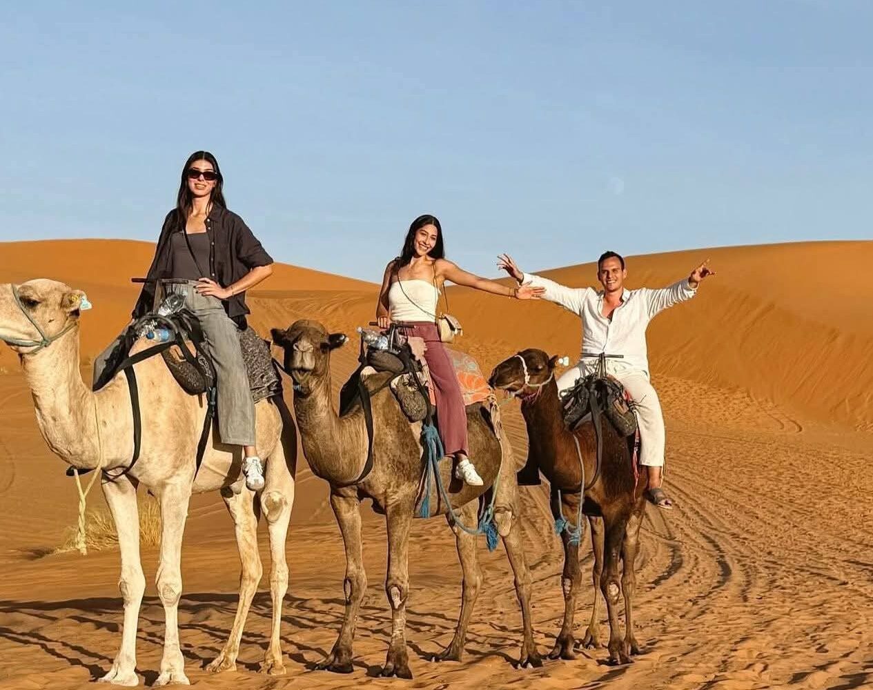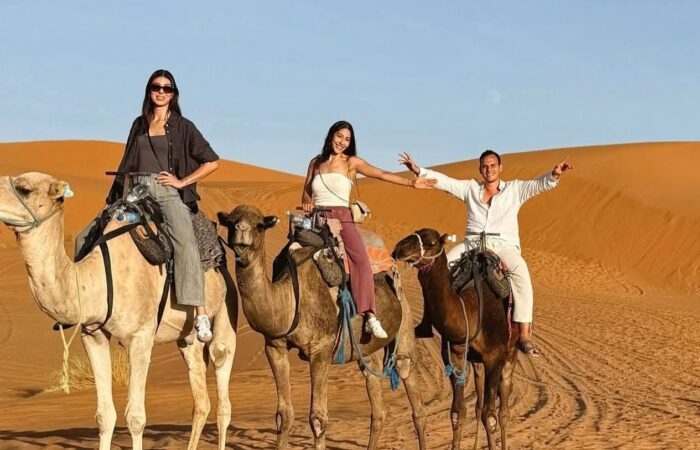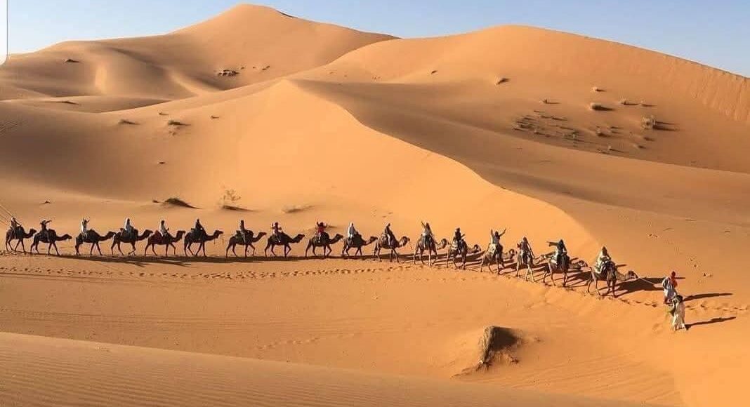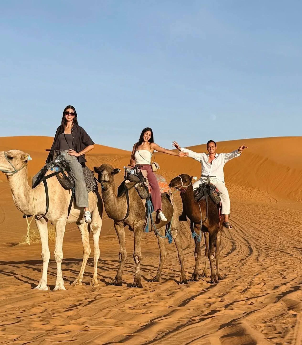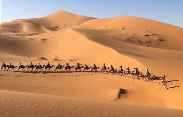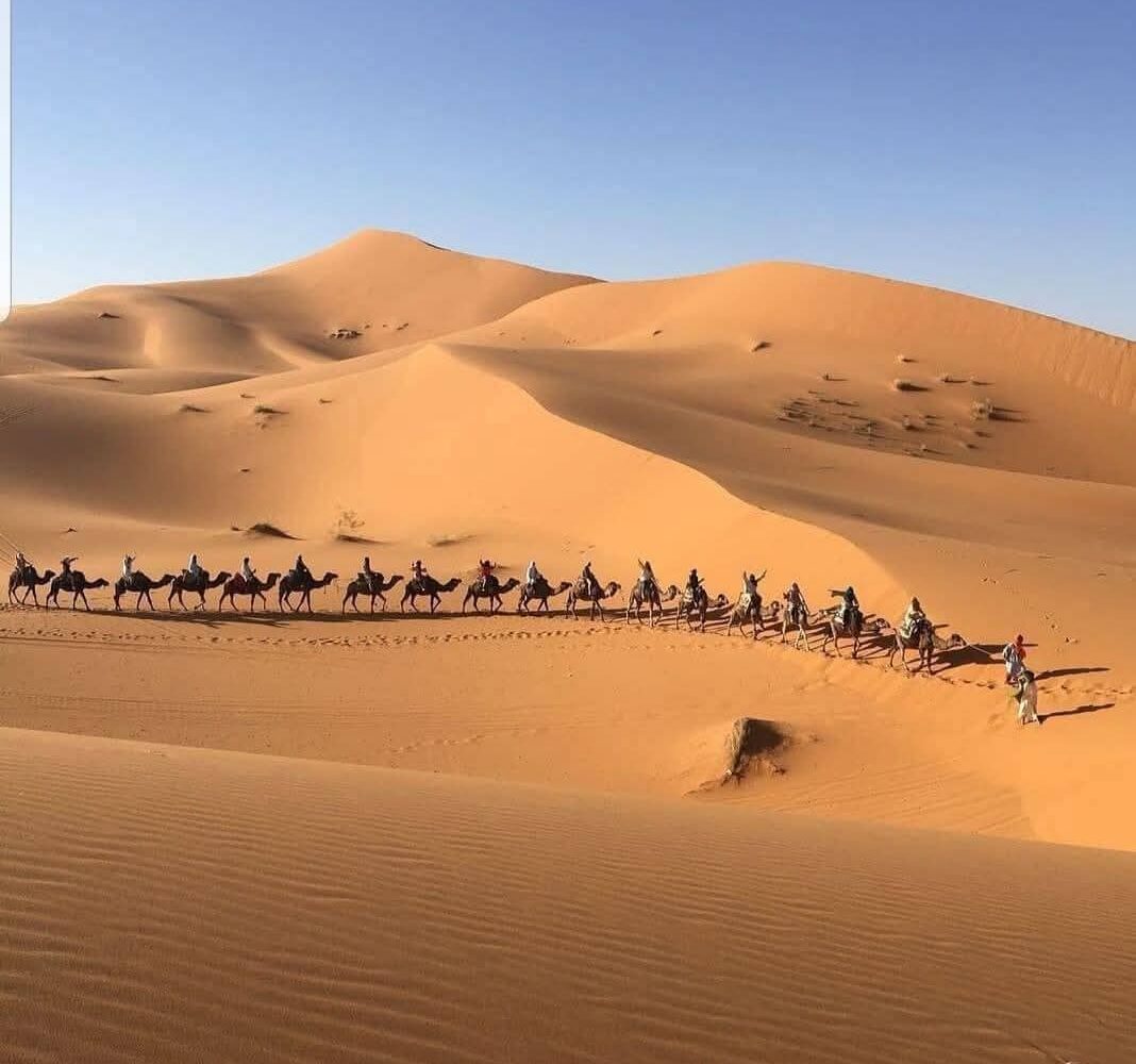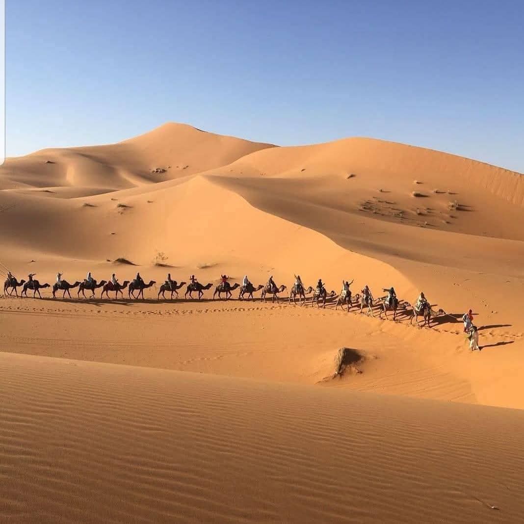 Και καθώς ο ήλιος δύει, το ταξίδι συνεχίζεται προς τη Σαχάρα, την απέραντη έρημο που μαγεύει με την ησυχία και τη γαλήνη της. Μια βόλτα με καμήλες ανάμεσα στους χρυσαφένιους αμμόλοφους οδηγεί σε ένα καταυλισμό νομάδων, όπου το βράδυ σας περιμένει κάτι πραγματικά μοναδικό: δείπνο κάτω από τα αστέρια, γύρω από τη φωτιά, με ήχους παραδοσιακής μουσικής και τον ουρανό της ερήμου να λάμπει από εκατομμύρια φώτα.